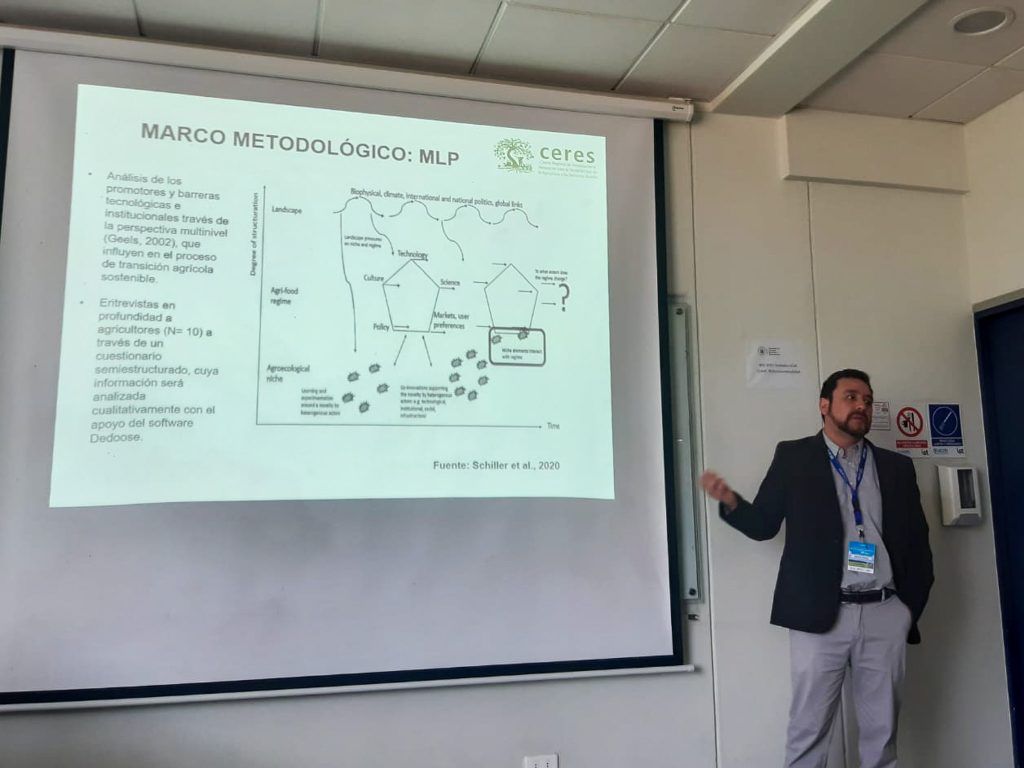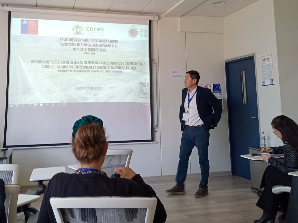 En representación de Ceres, su director ejecutivo Carlos Huenchuleo, también académico de la Escuela de Agronomía de la Pontificia Universidad Católica de Valparaíso (PUCV); junto al profesional Adrián Rivera; y Keira Dymond, investigadora postdoctoral; y Lisandro Roco, académico de la Facultad de Economía y Gobierno de la Universidad San Sebastián en Valdivia e investigador asociado de Ceres; fueron los encargados de dar a conocer las últimas investigaciones del centro regional. En sus ponencias, abordaron la sostenibilidad agrícola desde dos veredas: una de ellas analizó el uso de semillas en sistemas orgánicos y agroecológicos, mientras la otra presentó preliminarmente las barreras y promotores que inciden en la transición hacia una agricultura sustentable en América Latina, y la gestión de los recursos hídricos en Chile.